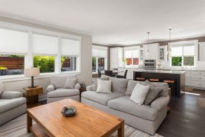 Beautiful living room interior with hardwood floors in new luxury home. Has view of Kitchen